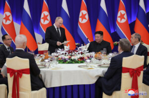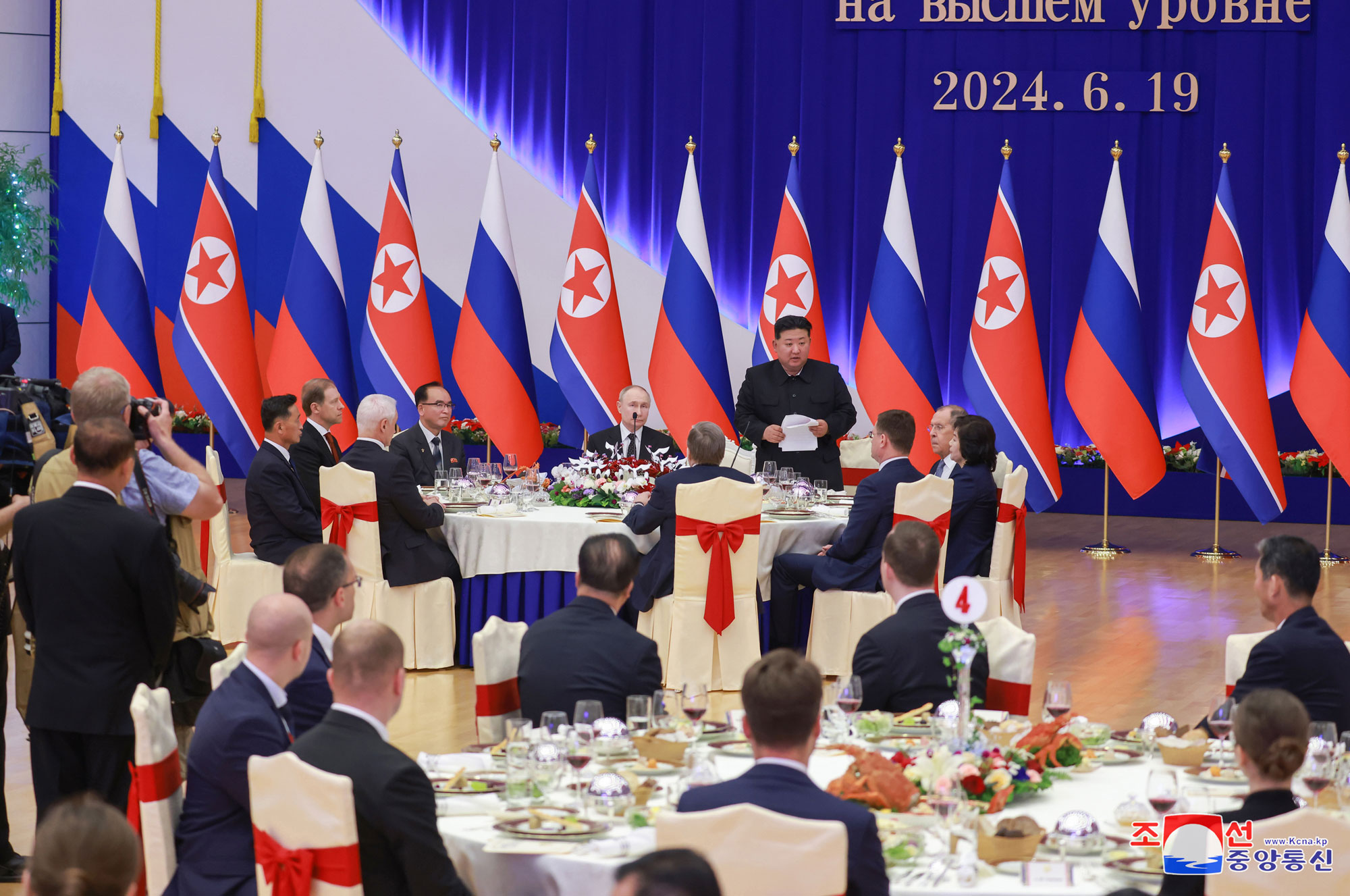 Propuso brindar por la salud del respetado camarada Putin, por la prosperidad continua de Rusia, vecino más amistoso, por la eternidad de los indestructibles vínculos de amistad Corea-Rusia, que serán envidiados por el mundo, y por la salud de todos los camaradas y amigos presentes en la recepción.