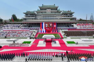 En la sede decorada especialmente para la ceremonia solemne de ese día, estaban flameando las banderas nacionales de la RPDC y la FR y enfiladas la Guardia de Honor y la Caballería de Honor del EPC y la banda militar central del Ministerio de Defensa Nacional.