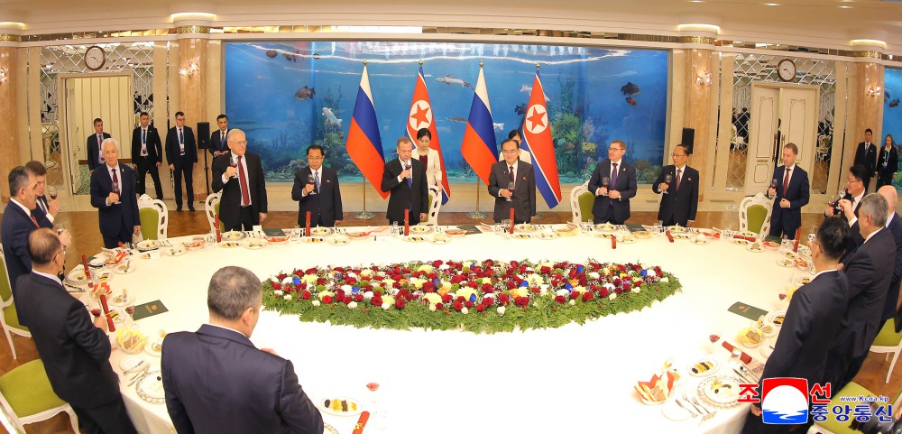 Los participantes hicieron brindis por la salud del estimado camarada Kim Jong Un, Secretario General del PTC y Presidente de Asuntos Estatales de la RPDC, y del Presidente de la Federación Rusa, Vladimir Vladimirovich Putin, y por el bienestar y prosperidad de los pueblos fraternales de ambos países.